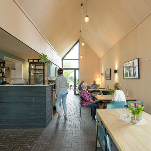 Dieses Beispiel steht für das Weiterbauen und für das Weiterdenken von Vorhandenem, sowie die Umsetzung und Betrieb von Projekten mit der Stärke der Gemeinschaft eines Dorfes. Ein ehemaliger Lagerschuppen wurde umgebaut und aufgewertet zu einem Laden mit Café (rd. 70 m²) und angrenzender Terrasse direkt neben Spiel-, Boule- und Bolzplatz. Das vormals unbeheizte Haus lädt heute an den Wochenenden zu Kaffee und Kuchen ein, die nachhaltige, demontierbare Holzfassade zeigt die Verwandlung im Außen, weiß lasierte Birkensperrholzplatten im Inneren. Mit einer PV-Anlage könnte der Stromverbrauch für die Kühlgeräte mit der Kraft der Sonne gedeckt werden - hierfür fehlt es noch an finanziellen Mitteln.