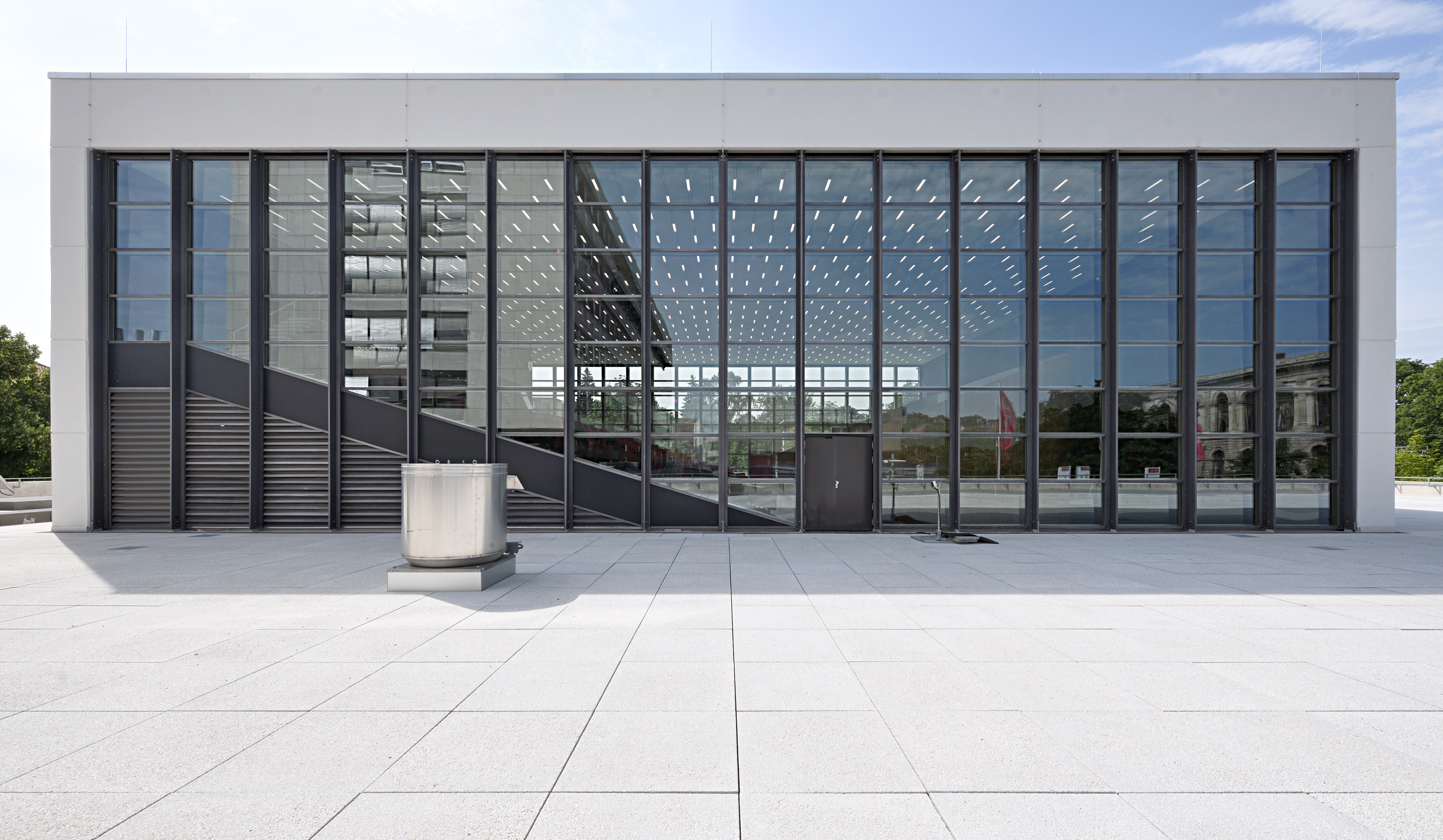 „Die 9,0 m langen eloxierten Aluminiumprofile tragen eine mehrschalige Glasfassade mit außenliegender Festverglasung und innenliegenden Kippflügeln. In die Profile integriert sind elektrisch verfahrbare Sonnenschutz- und Verdunklungsanlagen. Nach der Betoninstandsetzung des Sturzes und einer schonenden Reinigung der Aluminiumprofile wurden diese wieder an der Originalposition eingebaut. Die