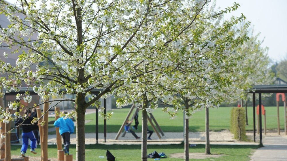 Eine breite Kirschbaumallee weist den Weg tief in den Raum des Schulhofes. Die Schüler erleben Wachstum und den Wandel der Jahreszeiten unmittelbar. Viel Platz zum Toben und Spielen, Bäume und Büsche zum Verstecken, modellierte Landschaften, Plätze zum Verweilen sowie ein "grünes" Klassenzimmer bieten den Schülern einen ganzheitlichen Erfahrungsraum und einen Ort der Naturbegegnung.