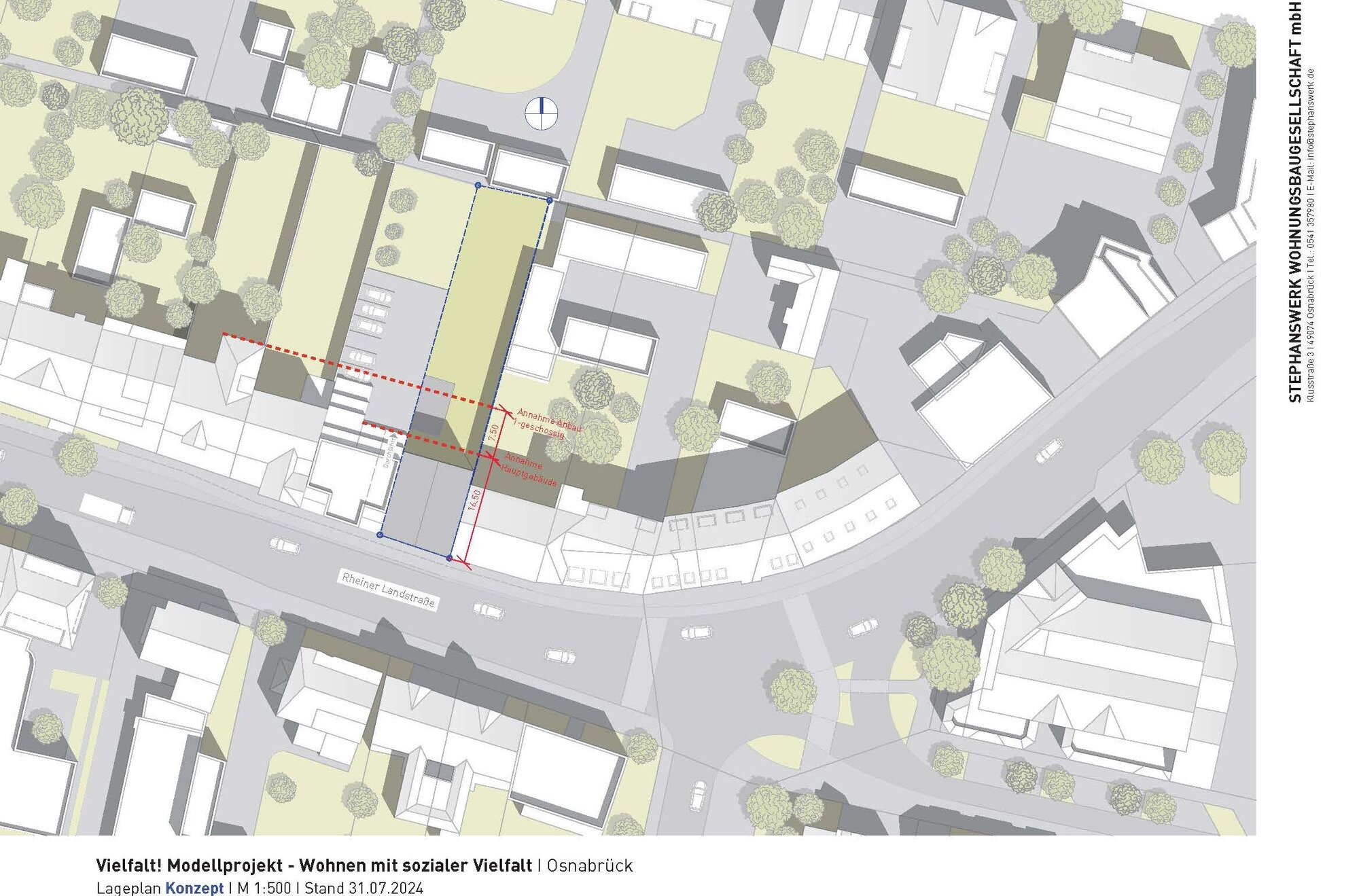 Das Stephanswerk Osnabrück bearbeitet in der Rheiner Landstraße 6 in Osnabrück das Modellprojekt Wohnen mit sozialer Vielfalt. Auf dem ca. 645 Quadratmeter großen Grundstück mit einem Bestandsgebäude an der Rheiner Landstraße soll im Rahmen einer Nachverdichtung im hinteren Grundstücksbereich nach § 34 BauGB grundrissoptimierter und autofreier Wohnraum entstehen. „Soziale Vielfalt“ steht über dieser Planungsidee. Anstelle des Bestandsbaus direkt an der Rheiner Landstraße soll ein Neubau mit neun Wohnungen entstehen. Das Haupthaus erstreckt sich über fünf oberirdische Geschosse mit insgesamt sechs Wohngemeinschaften. Im Erdgeschoss befinden sich Gemeinschaftsräume, Büros sowie ein Abstellbereich für Fahrräder. Über einen barrierefreien Durchgang erschließt sich das rückwärtige Grundstück. Mittels eines erdgeschossigen Anbaus - die Platzierung des Anbaus lehnt sich an die rückwärtige Bebauung der Nachbargrundstücke mit Nebengebäuden und Wohnungen an – wird die Bebauung nachverdichtet. Dort sind drei rollstuhlgerechte Wohnungen vorgesehen.“