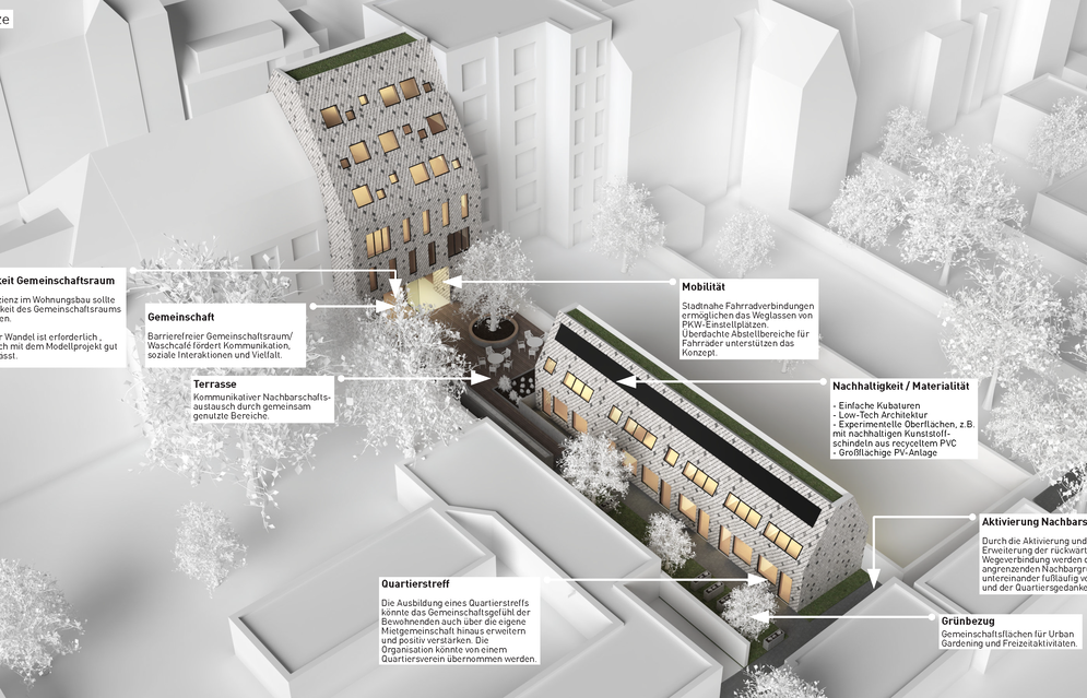 Da der Bestandsbau nicht wirtschaftlich saniert werden kann, entsteht entlang der Rheiner Landstraße ein fünfgeschossiger Neubau mit neun Wohneinheiten. Das Haupthaus umfasst sechs Wohngemeinschaften sowie Büros, einen Fahrradbereich und einen zentralen Gemeinschaftsraum im Erdgeschoss. Ein barrierefreier Durchgang führt zum hinteren Grundstück, wo ein eingeschossiger Baukörper mit drei rollstuhlgerechten Wohnungen geplant ist.