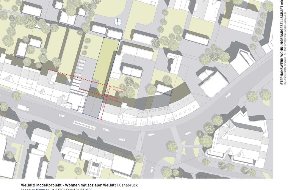 In der Rheiner Landstraße 6 in Osnabrück soll mit dem Modellprojekt „Wohnen mit sozialer Vielfalt“ innovativer Wohnraum mit viel Raum für Gemeinschaft geschaffen werden. Auf dem rund 645 Quadratmeter großen Grundstück soll im hinteren Bereich eine Nachverdichtung stattfinden.