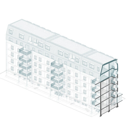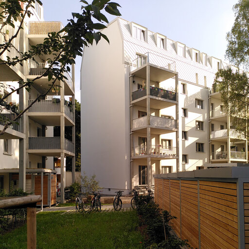 Im Rahmen der Analyse des Bestandsgebäudes und der Untersuchung des städtebaulichen Kontexts, gepaart mit unserem Anspruch ressourceneffizient zu bauen, kristallisierte sich heraus, dass nicht nur ein Ausbau des bestehenden Daches, sondern eine Aufstockung über zwei Geschosse umsetzbar wäre. Die Schaffung von 24 neuen Wohnungen unterschiedlicher Größe und gleichzeitiger energetischen Sanierung des vorhandenen Bestandes und Ergänzung dieser um "Außenzimmer" (10m² große Balkone) im bewohnten Zustand mit der Möglichkeit, ein Effizienzhauses 55 zu schaffen, konnten den Bauherren, die Ostland Wohnungsgenossenschaft, von der Umsetzung überzeugen.