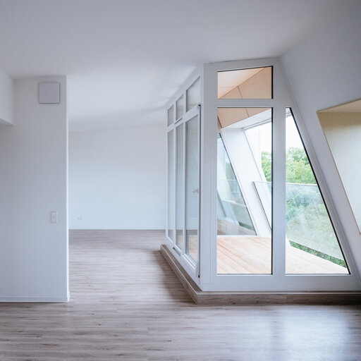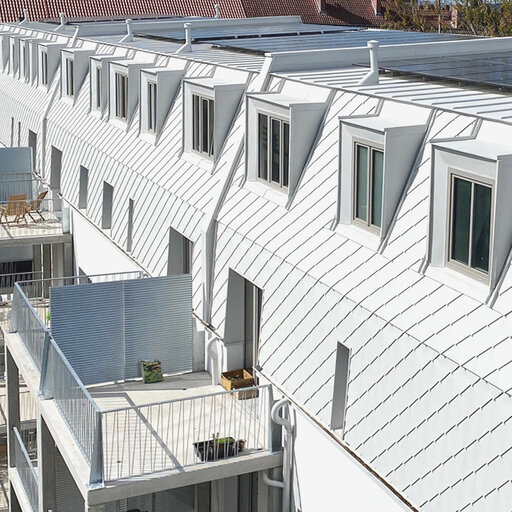 Die Aufstockung von zwei Gebäudezeilen im innerstädtischen Bereich um zwei Geschosse und die folgende Schaffung von bezahlbarem Wohnraum unterschiedlichster Größe (35-105m²) ohne zusätzliche Versiegelung von Boden war der Anfang der Idee. Die Ausführung mit nachwachsenden Rohstoffen (Holz, Zellulose) und die energetische Aufwertung des Bestandes war eine logische Folge. Wo möglich, wurde sortenrein rückbaubar geplant. Zum Beispiel lässt sich die Wahl der hellen Aluschindeln als leichte Dacheindeckung rückbauen und dem Stoffkreislauf zuzuführen und wirkt sich gleichzeitig durch den Reflexionsgrad positiv gegen Überhitzung aus.
