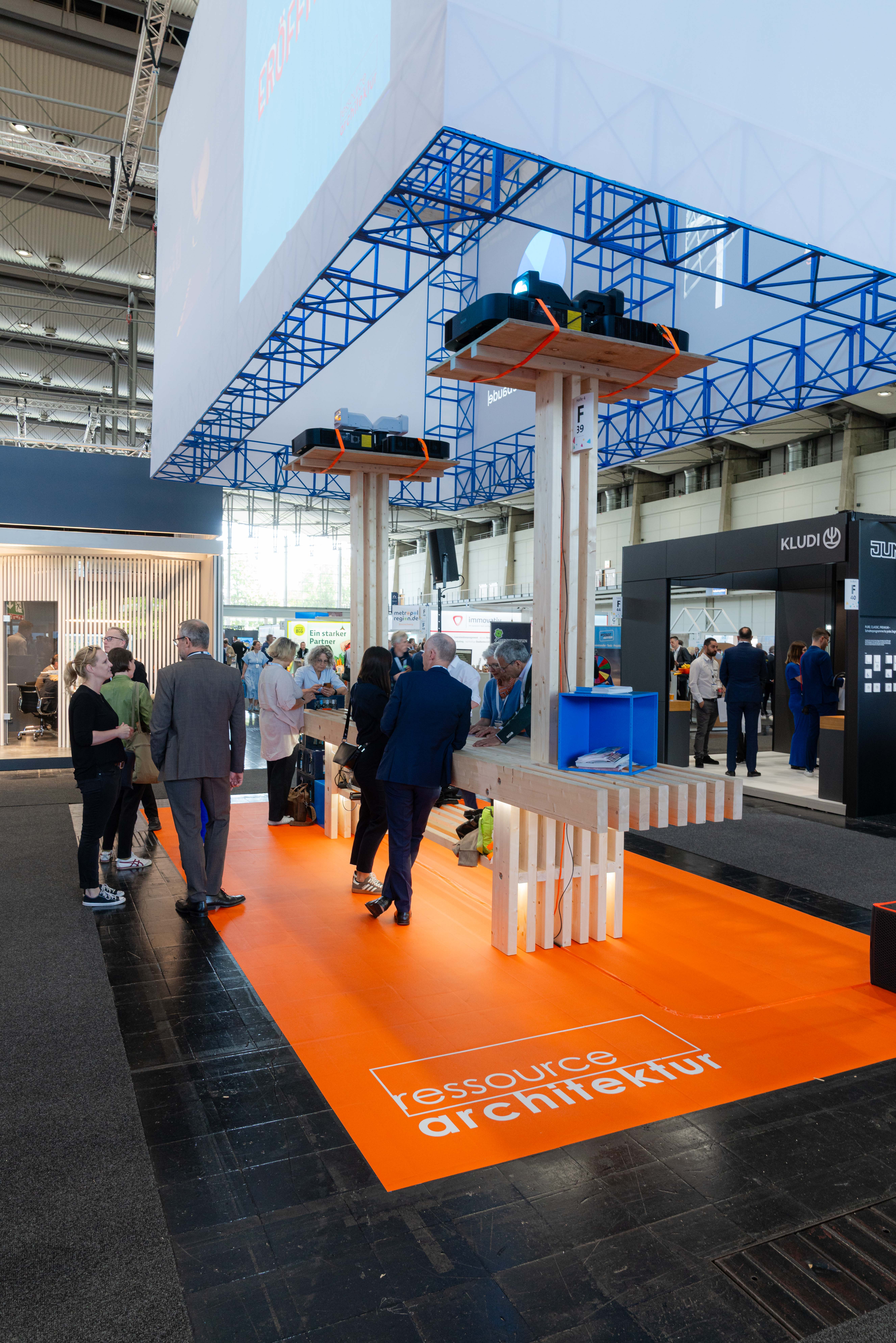 Zum vierten Mal war das Projekt „ressource.architektur“ am 14. und 15. Mai 2025 ein Highlight der Real Estate Arena auf der Messe in Hannover. Eyecatcher und Kommunikationsknotenpunkt mitten in Halle 4 war auch dieses Jahr wieder der Gemeinschaftsstand der Berufsverbände BDA, BDLA, BDB, dem Netzwerk Baukultur Niedersachsen, der Architektenkammer Niedersachsen sowie der Leibniz Universität und der Hochschule Hannover: orange/blau, ein fünf Meter langer Holztresen überragt von einem mit Leinwand bespannten Metallgestell aus blauen Regalmodulen auf orangem Grund: Entworfen und bis ins kleinste Detail geplant von Architekturstudierenden der Leibniz Universität Hannover und aufgebaut mit Unterstützung von Auszubildenden der Firma Hanebutt.
