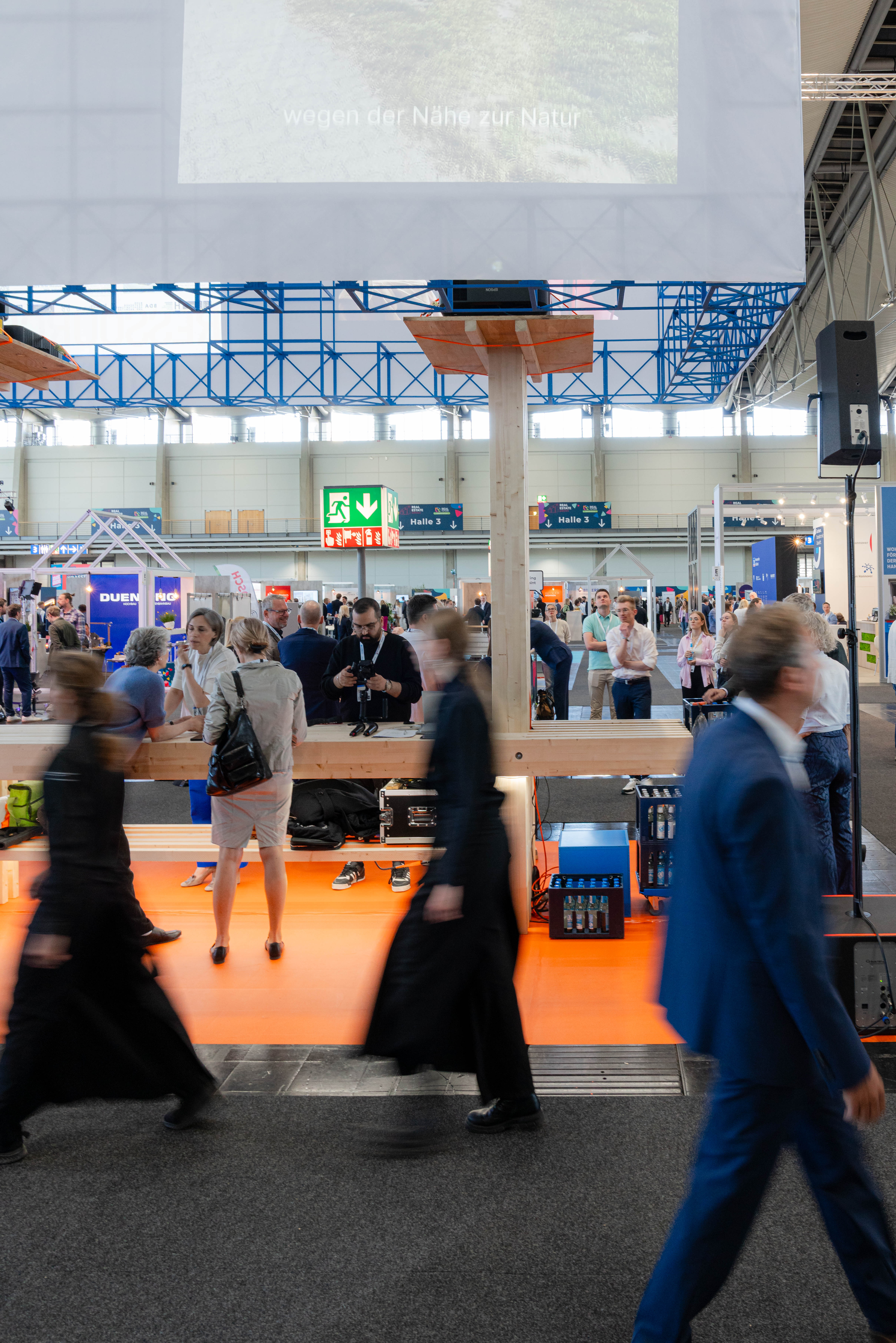 Der Entwurf und Umsetzung des außergwöhnlichen Messestandes erfolgte als Design-Build Projekt durch Studierende der Hochschule Hannover und der Leibniz Universität Hannover. Außergewöhnlich deshalb, weil die zumeist studentischen Protagonistinnen und Protagonisten dieses Gemeinschaftsstandes des BDA, BDB, BDLA, bdia, SRL, der DASL, des Netzwerks Baukultur Niedersachsen sowie der Hochschule Hannover und der Leibniz Universität keine Mühen gescheut hatten, um auch in diesem Jahr wieder einen Stand zu entwickeln, der das Highlight der Messe war: Mehrere tausend Holzmodule in Form eines Doppel-H und zwei aus einem Abrissgebäude stammende Betontreppen ließen auf dem 100 qm großen mehrere Räume entstehen, schafften Sitzgelegenheiten und boten viel Gesprächsstoff. Hintergrund dieser Rauminstallation war die Idee der Zirkularität und Wiederverwertbarkeit der Baustoffe, die auf diese Weise sichtbar gemacht werden konnte.