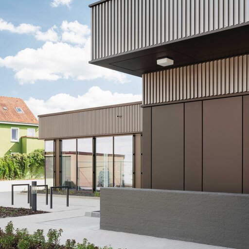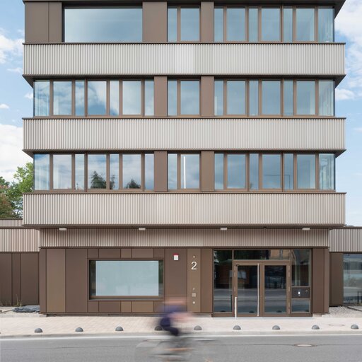 Das ehemalige Postgebäude wurde bis auf die Stahlbeton-Skelett-Struktur vollständig entkernt. Der Grundriss erfuhr eine gänzliche Neuorganisation für die Umnutzung als Bank- und Verwaltungsgebäude. Der Innenausbau sowie die Gebäudehülle wurden neu aufgebaut und energetisch auf neuen Stand gebracht. Die Fassadengestaltung lehnt sich an die Bestandserscheinung an und nimmt mit den durchlaufenden Fassadenbändern deren charakteristische Eigenschaften auf. Die vorgehängte hinterlüftete Fassade besteht aus langlebigem eloxiertem Aluminium mit 90 % Recyclinganteil. Als Primärenergiequelle dient ein neues Geothermie-Sondenfeld unterhalb der Parkplatzfläche, wodurch die Heizung des Gebäudes zukünftig ohne fossile Energieträger auskommt. Der Aufbau einer PV-Anlage auf dem Dach unterstreicht die nachhaltige Ausrichtung des Projektes.